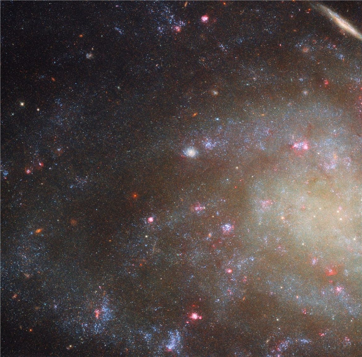 The portrait uses data drawn from two complementary observing programs. The first took a broad view of 50 nearby galaxies, leveraging Hubble’s ability to observe ultraviolet through visible into near-infrared light to study star formation in these galaxies. The second program examined many of the same nearby galaxies as the first, narrowing in on a particular wavelength of red light called H-alpha. Star-forming nebulae are powerful producers of H-alpha light, and several of these regions are visible across NGC 45 as bright pink-red patches.